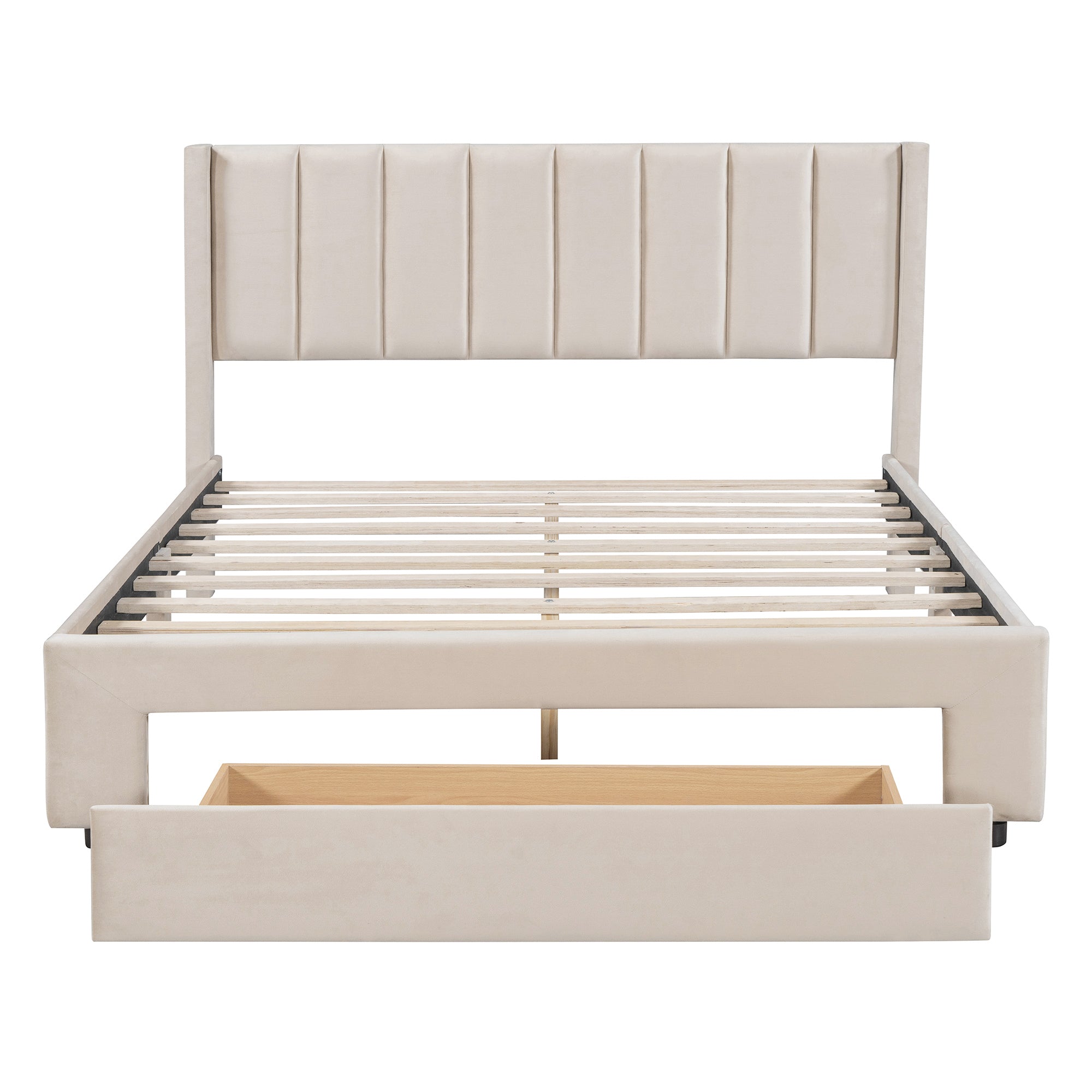 This velvet upholstered platform bed features a structured frame with an integrated storage drawer at the base. The clean-lined headboard and smooth fabric finish create a balanced and functional bedroom centerpiece.