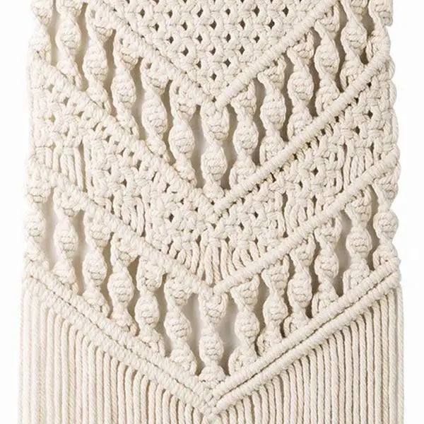 This woven wall hanging features a vertically structured macramé design with layered knot detailing. The neutral beige finish and textile construction create a clean decorative accent intended for wall display.